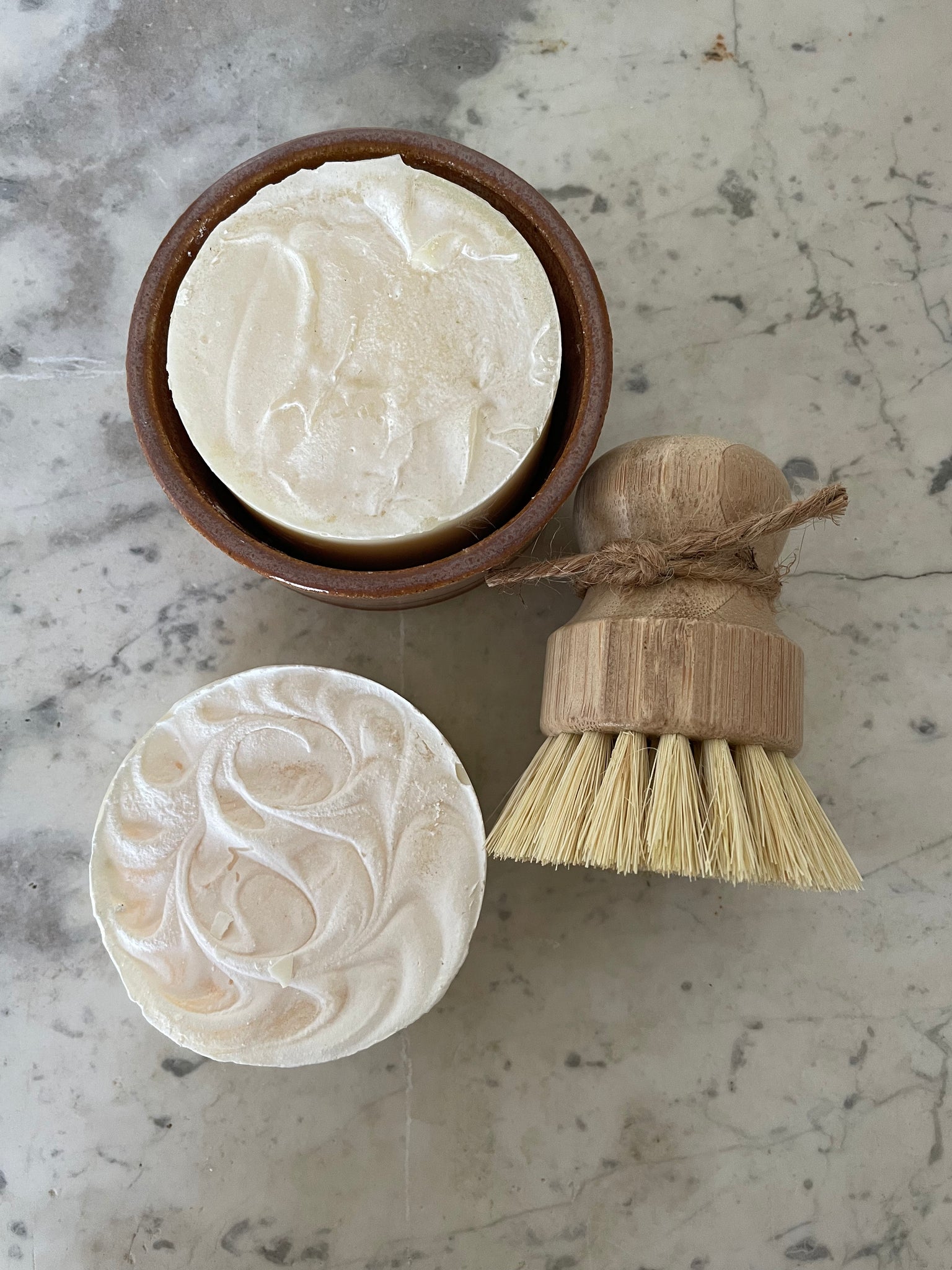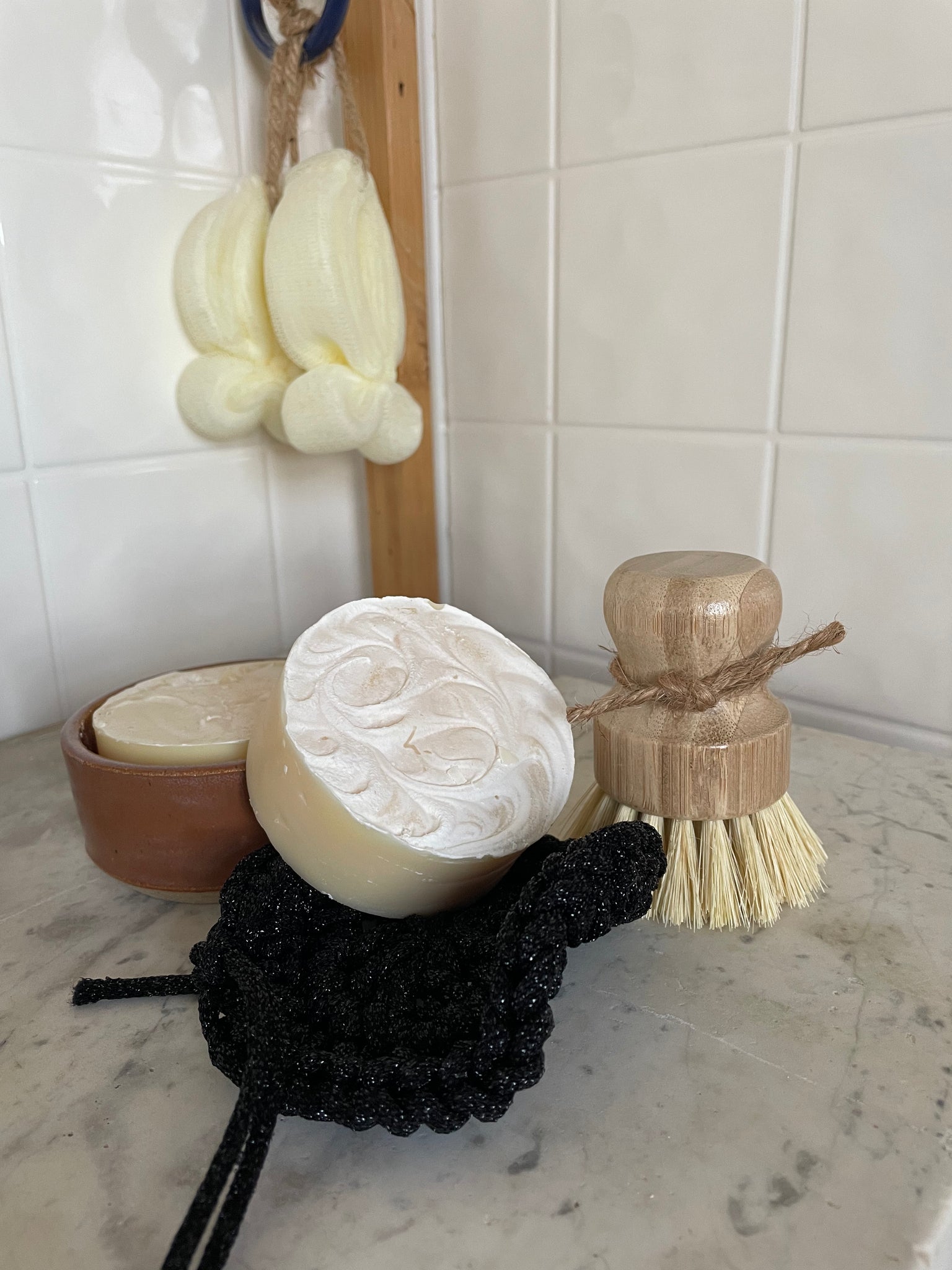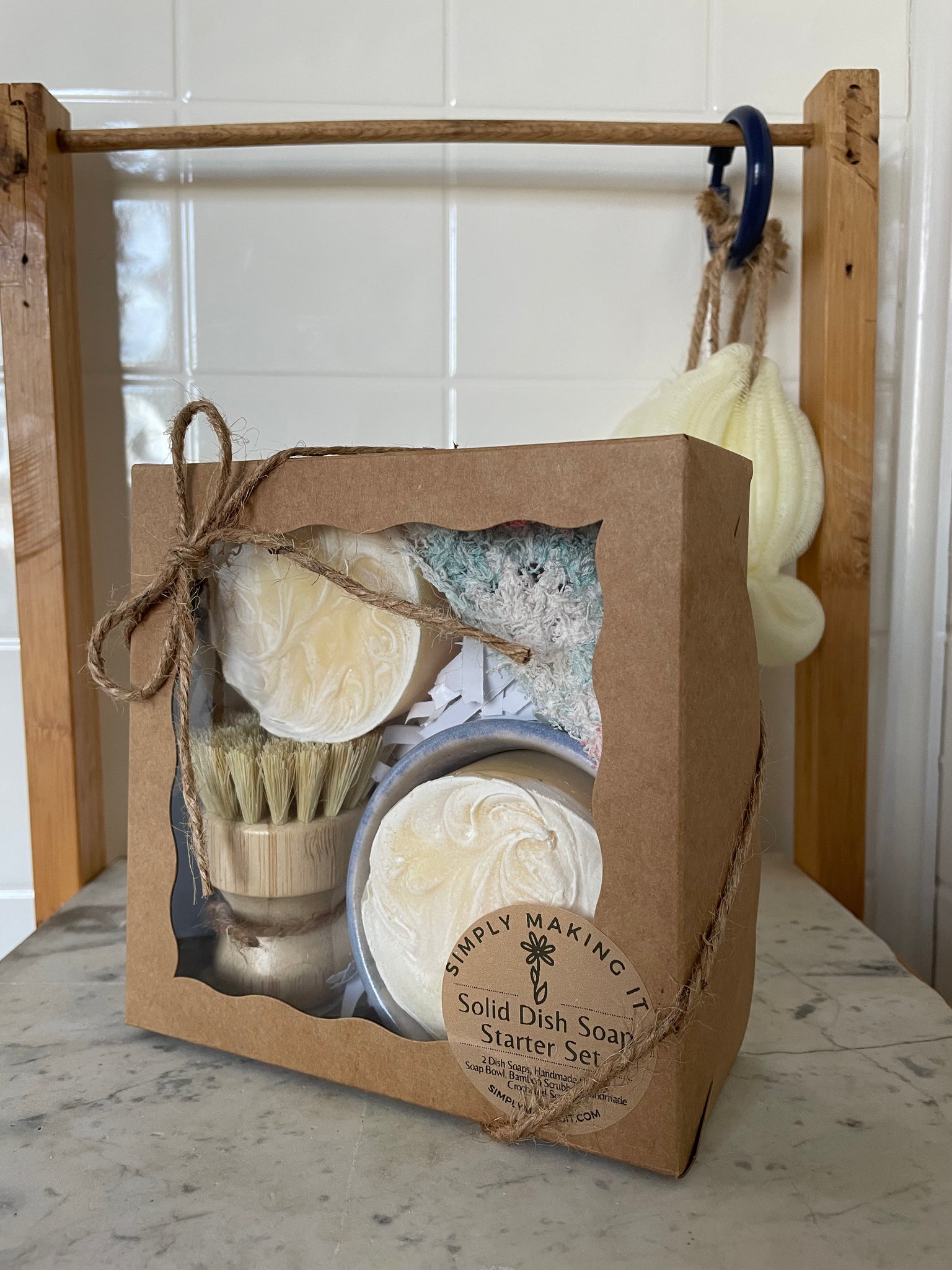 Starter set includes a bowl, 2 dish soaps, bamboo scrub brush, and a handmade pot scrubber.